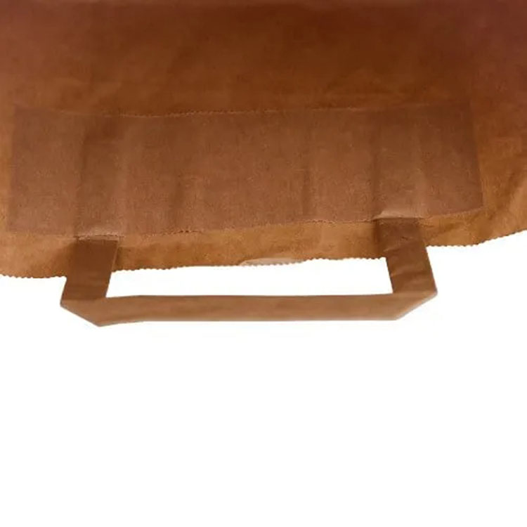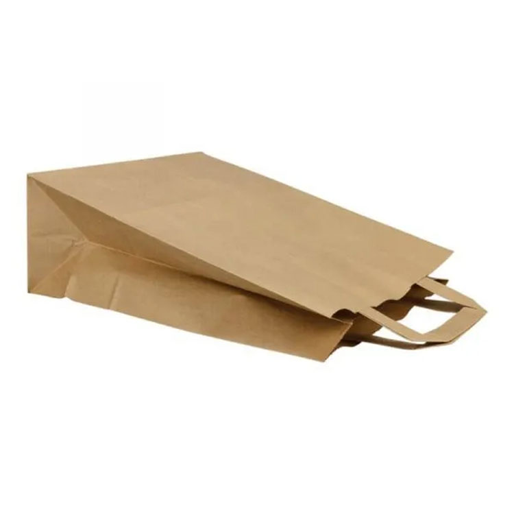 फ्लैट पेपर हैंडल के साथ क्राफ्ट पेपर बैग का उपयोग कैटरिंग उद्योग में, सुपरमार्केट में और उपहार के रूप में किया जा सकता है। वे मजबूत और टिकाऊ सामग्री से बने होते हैं, कई बार पुन: उपयोग किए जा सकते हैं, खाद और बायोडिग्रेडेबल हैं।